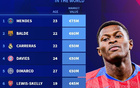 德转列左后卫身价榜:努诺-门德斯7500万欧居首,巴尔德第二